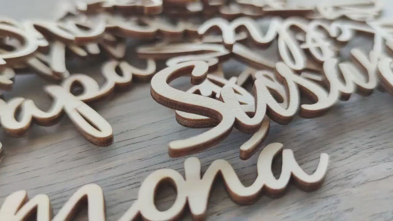 Moderne, zeitlose Platzkarten in Form von Holzschriftzügen. In Kombination mit den Untersetzern "Schön, dass du da bist" machen die Platzkarten so richtig etwas her. Die Kombi eignet sich zudem auch super als Gastgeschenk.